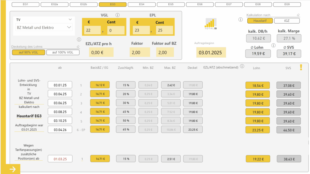 Die Kalkulation erfolgt faktorbasiert, das heißt das der Stundenverrechnungssatz in den Stufen branchenüblich über einen Faktor aus dem Lohn ermittelt wird. Dabei werden natürlich Vergleichslohn und Equalpaylohn ebenfalls berücksichtigt, so wie die tarifkonformen Regelungen zu einem ‚Mindestbranchenzuschlag‚.